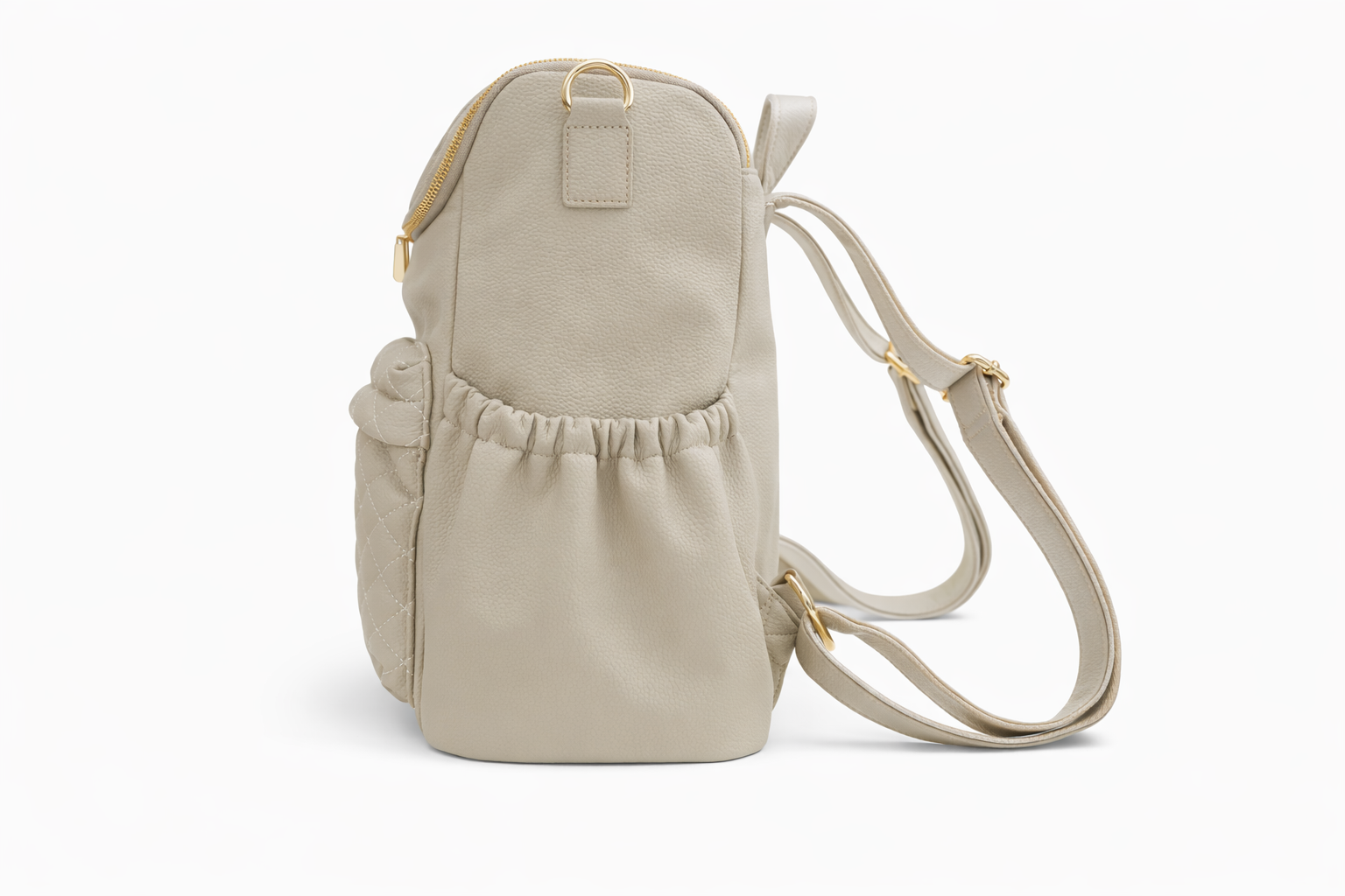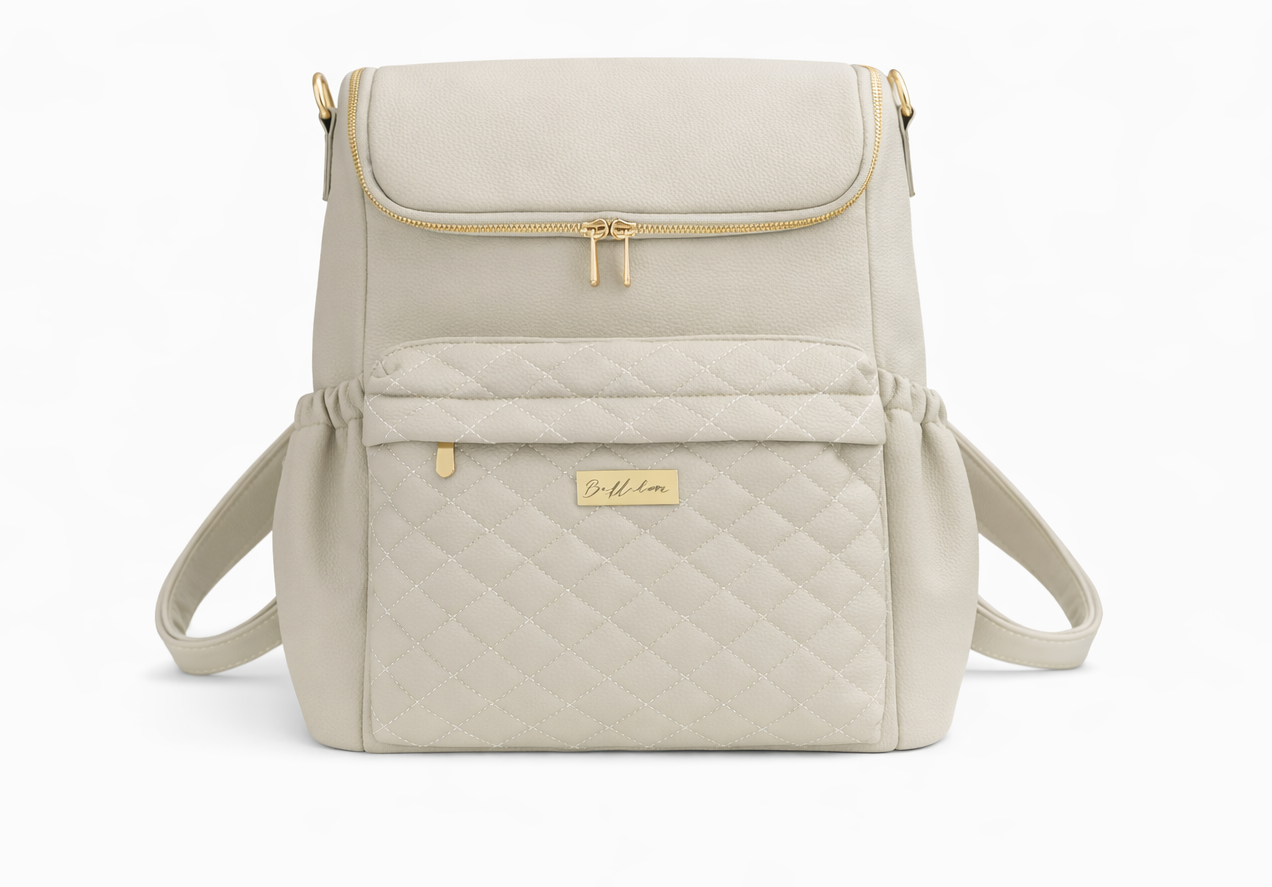 Soft faux leather with a luxury quilted detail. Wear as a backpack, crossbody bag or secure on your pram.